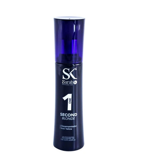 Sarah K One Second Blonde es un tratamiento matizante en spray de acción inmediata, diseñado para neutralizar reflejos amarillos no deseados en cabellos rubios, decolorados o con mechas. Su fórmula con pigmentos violetas actúa rápidamente sobre la fibra capilar, ayudando a conseguir un tono más frío, uniforme y luminoso en cuestión de segundos.